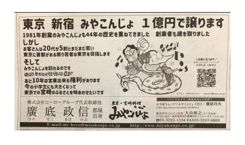 都城市から18歳で早稲田大学を目指し上京した創業者•廣底政信が新聞配達や居酒屋でのバイトを経て